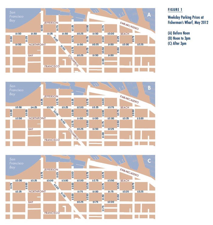 With funding from the FHWA in 2011, San Francisco began an ambitious program to set on-street parking prices at variable levels dependent on the demand for that area. Seven pilot zones were selected to have demand-based pricing, with prices adjusted every few weeks based on occupancy rates. For example, if occupancy rates are below 30%, the price is decreased by 50 cents per hour; if occupancy is above 80%, the price is increased 25 cents per hour (Figure: Weekday Morning Prices at Fisherman’s Wharf).