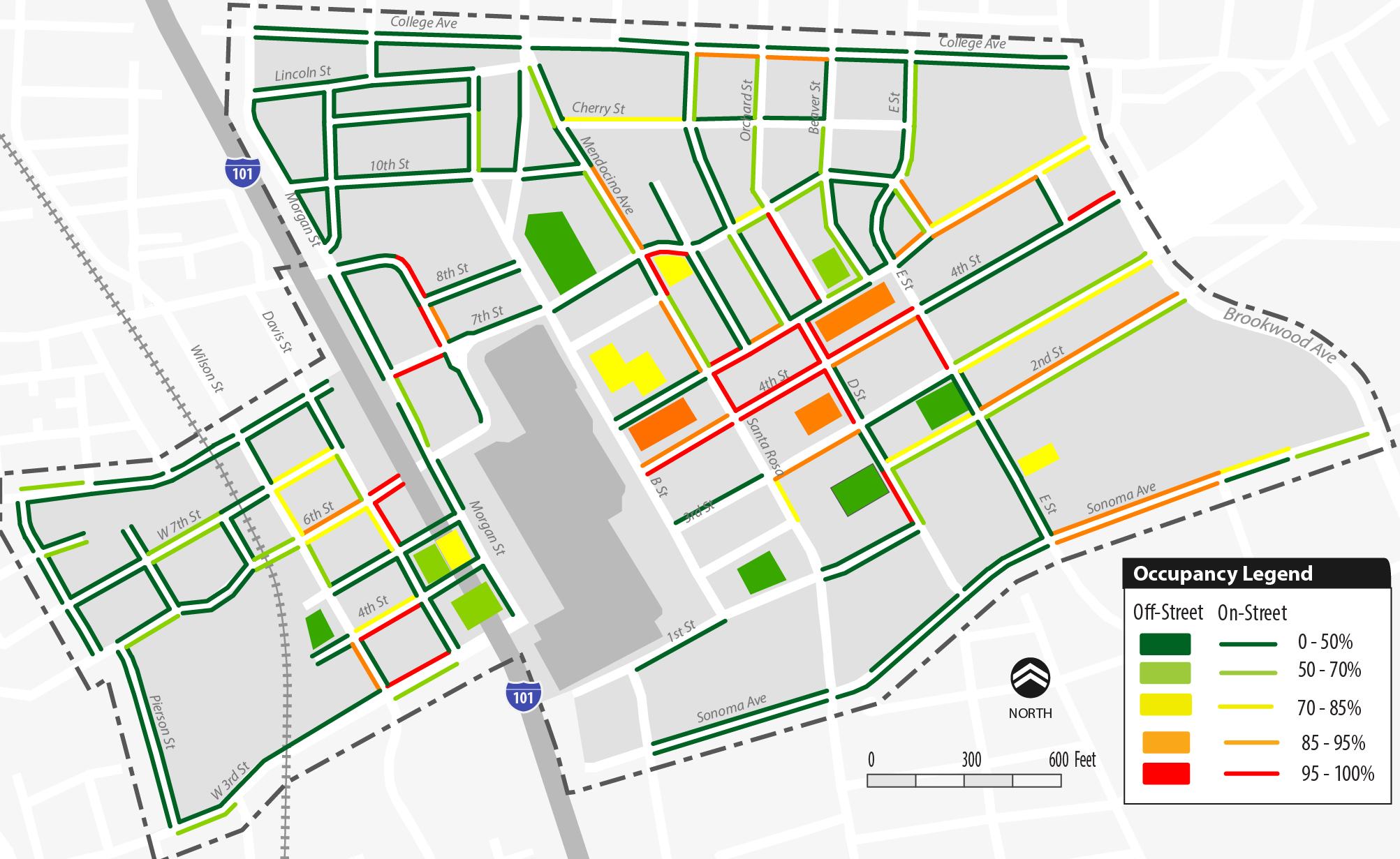 Figure 2: Example of a parking study in the City of Santa Rosa looking at the balance of supply and demand on a weekday at noontime.